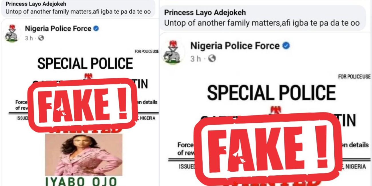The Nigeria Police Force has disowned a Wanted Person Bulletin circulating on social media, which claimed that popular Nollywood actress, Iyabo Ojo, was declared wanted by the Inspector-General of Police Monitoring Unit.