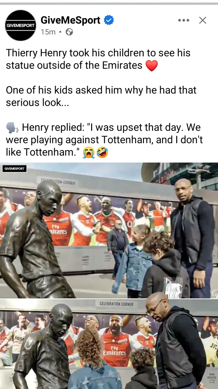 Revealing what Thierry Henry child asked him after he showed them his statue outside the Emirates Stadium, GiveMeSport posted: “Thierry Henry took his children to see his statue outside of the Emirates